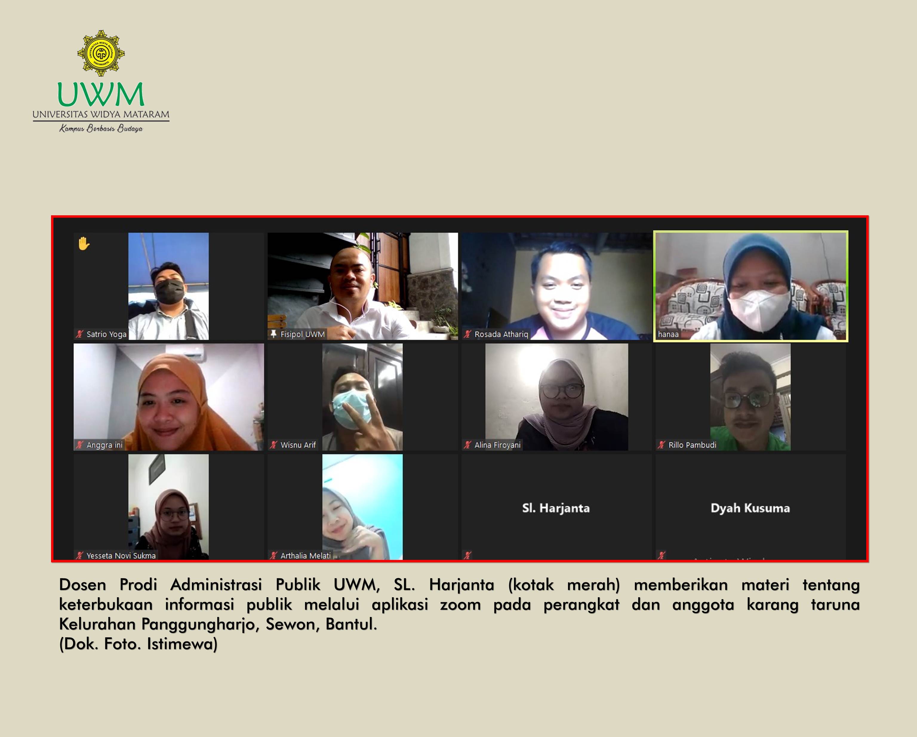 Keterbukaan informasi publik mendapatkan tantangan di masa pandemi ini. Interaksi yang terbatas menyebabkan penyebaran informasi yang dilakukan secara manual tidak efektif lagi. Maka dari itu, diperlukan langkah lain yakni dengan penggunaan media sosial secara lebih masif lagi. Demikian dikatakan Dosen Prodi Administrasi Publik Fakultas Ilmu Sosial dan Ilmu Politik Universitas Widya Mataram (UWM), SL. Harjanta dalam acara Sosialisasi Keterbukaan Informasi Publik (KIP) secara virtual.